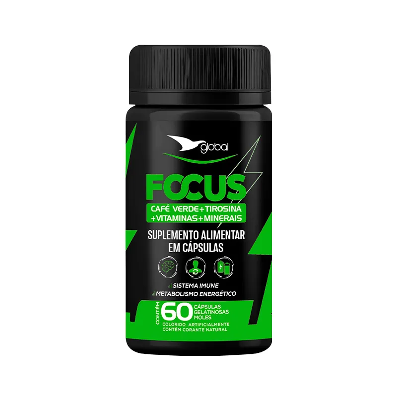FOCUS, é um suplemento alimentar em cápsulas gelatinosas moles, que fornece ácido clorogênico, tirosina, vitamina B3, B6, B9, B12 e cromo.